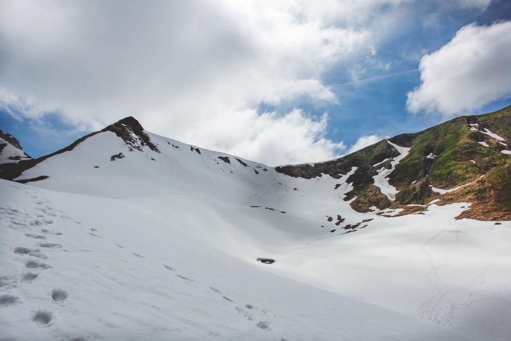 Malgré tous les panneaux d’indication, à cause de cette neige qui recouvrait la montagne, impossible de savoir si un chemin était tracé ou non. Nous avons rejoint le col de Floray un peu au feeling pour le coup ! Cette dernière montée était tellement raide que j’avais l’impression de faire de l’escalade. Je devais m’aider de mes mains pour monter. C’est à ce moment là qu’on s’est dit qu’il y avait forcément un petit souci … Ça ne pouvait pas être le chemin que nous devions emprunter ! Je suis curieuse de retourner à cet endroit une fois la neige fondue, pour me rendre compte à quel point nous étions loiiiin d’être sur le bon chemin !