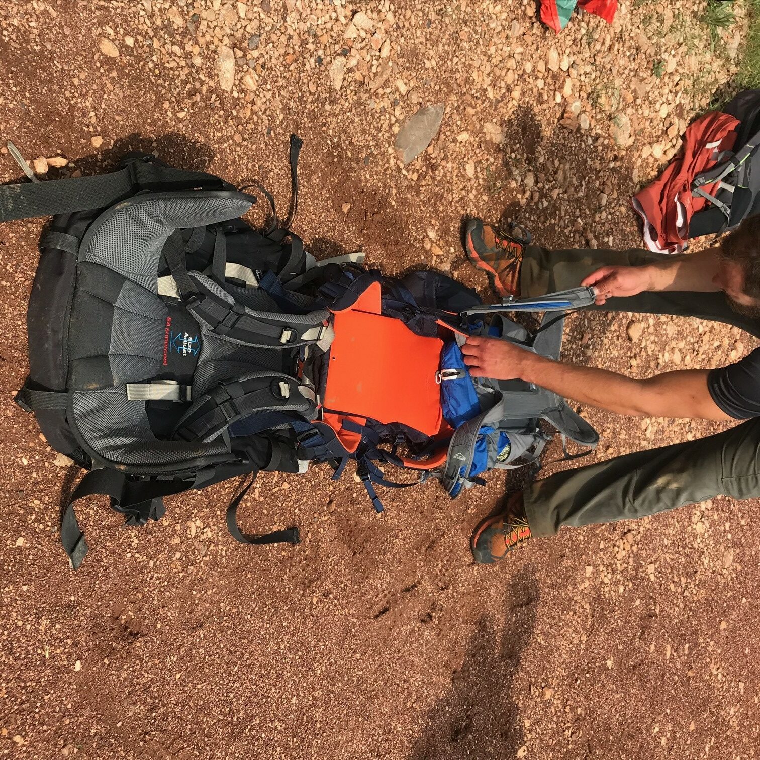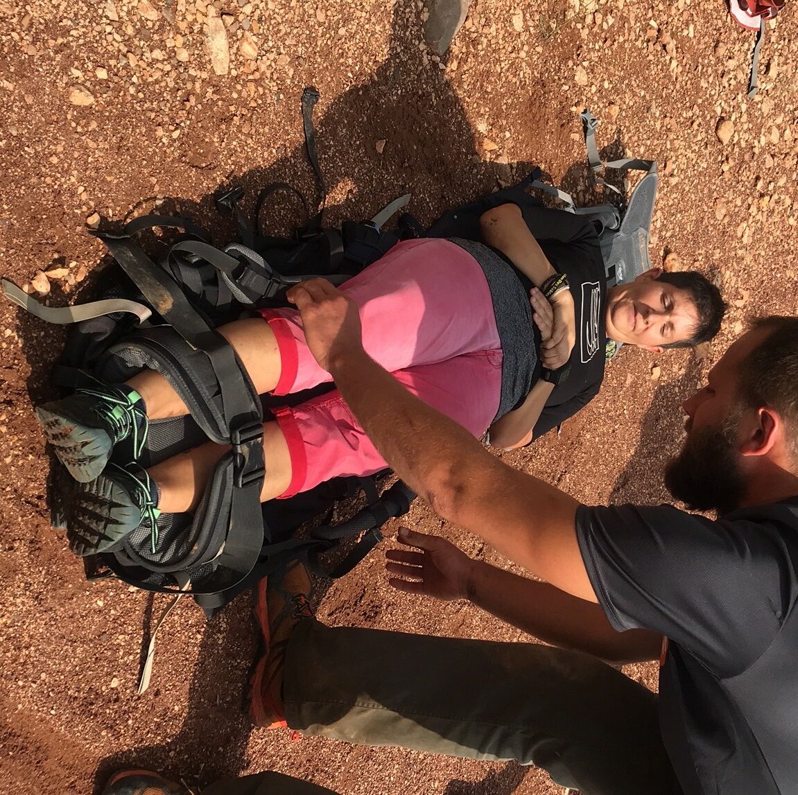 Plus loin, Benjamin nous a appris à faire un brancard avec nos sacs à dos, si jamais l’un de nous venait à se blesser. C’est absolument génial, je ne pensais pas que c’était possible de faire ça. Je crois que quasiment personne dans le groupe ne connaissait cette méthode et on peut dire que ça marche plutôt pas mal ! Évidemment, il faut être plusieurs pour pouvoir transporter la personne blessée. Cela devient plus compliqué si nous partons en randonnée à deux et que l’un se blesse. Petite piqûre de rappel aussi en nous rappelant comment mettre une personne en position latérale de sécurité, le temps d’attendre les secours.