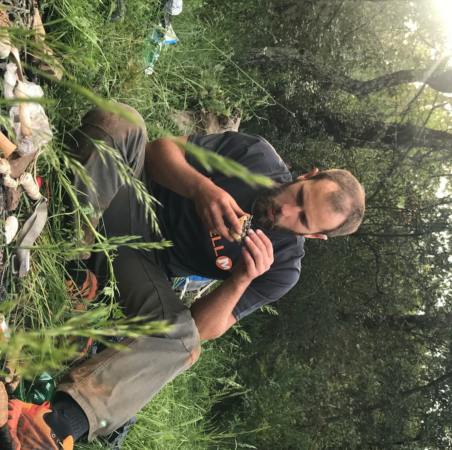 Une fois notre grand feu de bois allumé, nous avons mis le mode survie en pause pour faire péter les saucisses ! On récupère un bout de bois, on l’embroche et hop à cuire ! Pendant ce temps là, Benjamin nous préparait du pain avec de la farine, de l’eau, et du thym que nous avions ramassés plus tôt dans la journée. Un délice.